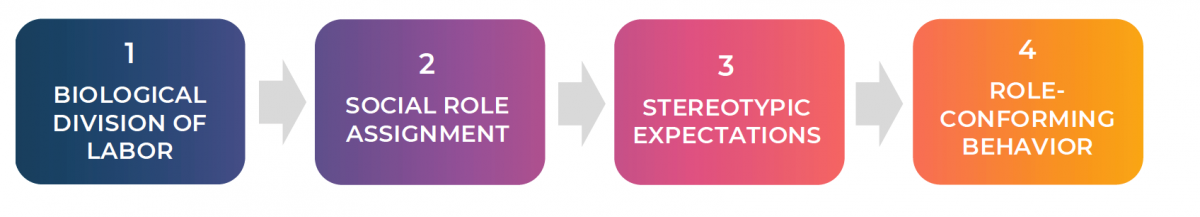 To discuss the impact of gender stereotypes in negotiations, it is first necessary to understand why men and women seem to behave differently in certain circumstances. For this question, theories from social psychology offer some interesting insights. Social role theory [4] and biosocial role theory [5] suggest that gender differences in behavior can be explained by societal expectations and roles assigned to men and women. Society expects men and woman to act in certain ways, which in turn actually results in them acting accordingly. These expectations stem from earlier division of labor and biological differences (see Figure 1.1; for example, certain activities might have evolutionarily been accomplished more efficiently by one sex over the other [6]). Over time, these observations on labor division evolved into social roles (2; for example, men being ‘breadwinners’ and taking jobs while women being family ‘caretakers’). These social roles then eventually turned into gender stereotypic expectations (3; for example, men being seen as powerful and women being expected to be nurturing [7]). Social role theory further suggests that people follow these role expectations because they get rewarded for acting according to them and get criticized if they do not. Put differently, people try to engage in role-conforming behavior (4; for example, men trying to behave more dominantly than women). This process illustrates how stereotypes can emerge historically and ultimately lead to different role-conforming behaviors in men and women