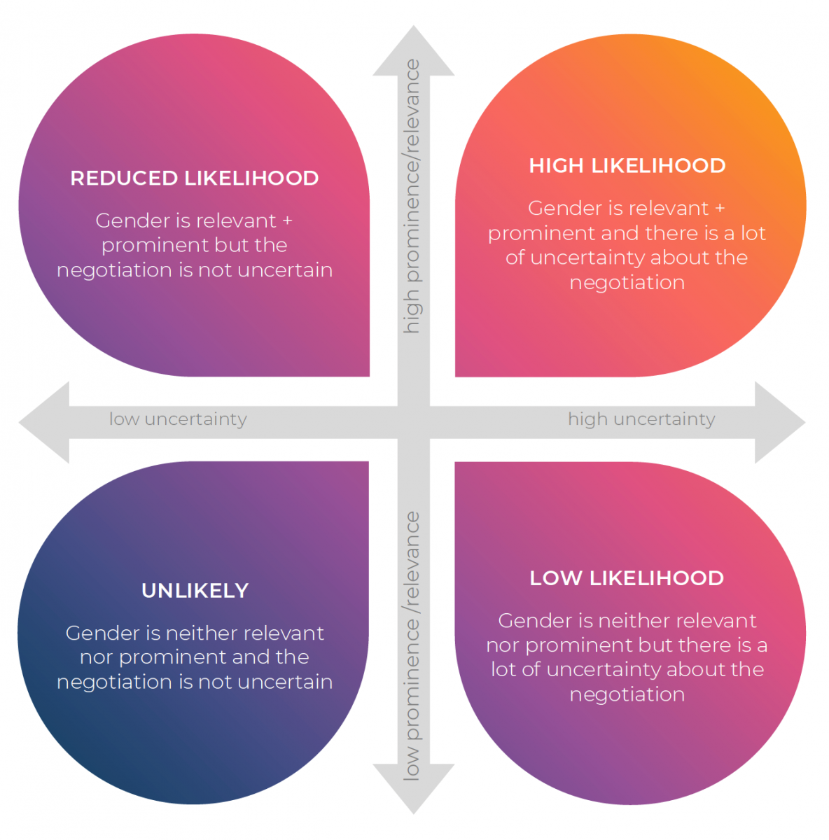 Besides these societal influences and gender stereotypes, other lines of research highlight that it is actually not the person’s gender that matters, but rather the gendered context in which a negotiation takes place. Scholars from these research lines argue that gender effects in negotiations exist, but that these dynamics vary substantially across situations. In other words, the effects of gender might be totally different when comparing two negotiation contexts, sometimes leading to better outcomes for women. More specifically, two major contextual influencing factors define the gender effects in negotiations: (a) the prominence or relevance of gender in the specific situation and (b) the uncertainty of the negotiation context [16] (see Figure 2). Prominence refers to the degree to which gender identity is obvious in a situation. Similarly, relevance refers to the extent to which gender plays a crucial factor in a specific situation. Both prominence and relevance can be shaped by the social context in which the negotiation takes place.