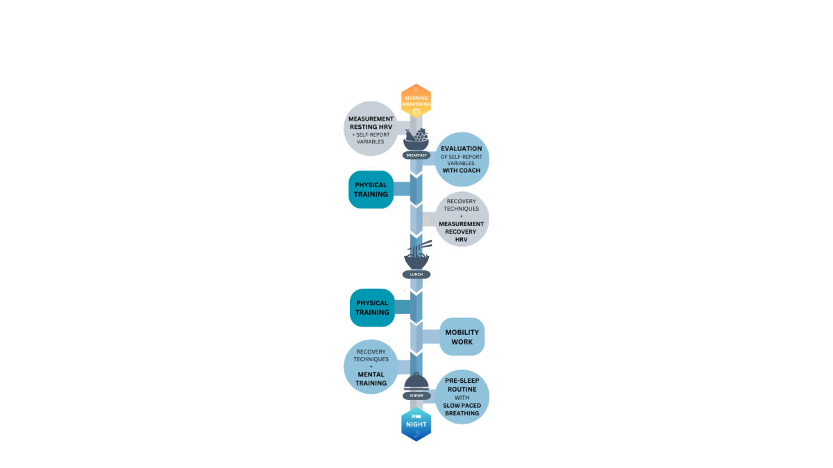 To correctly interpret your HRV, you should aim to measure it under similar conditions and at the same time each day [3, 4]. Therefore, to achieve accurate HRV readings, it is advisable to gather measurements in the morning, prior to any food intake, caffeine intake, physical activity, or mental stress [1]. A typical training day using HRV measurement is shown in Figure 1. Some of the most important