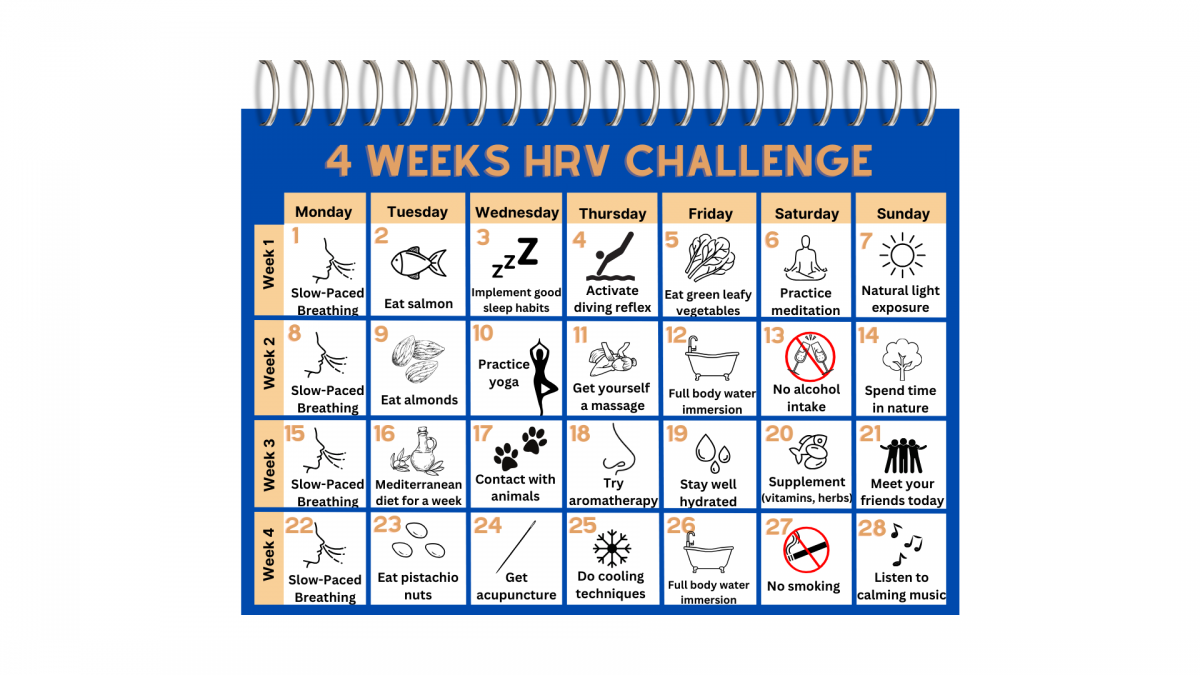 There are many ways to improve your HRV, which reflects better control of your heart by the calming part of your nervous system. These methods range from changing how you breathe, such as practicing slow-paced breathing (SPB), to using cold water immersion to trigger your body's response to cold. For a list of activities that can help increase your HRV over the course of 4 weeks, check out Figures 4a & 4b.