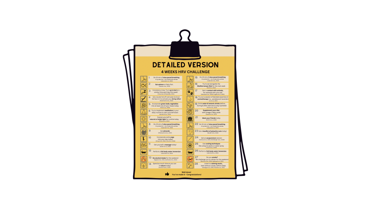Image 5b: Details of the 4 weeks HRV challengeSPB is an easy and affordable way to quickly improve your HRV, and apps like HRV4Biofeedback, iBreathe, or Awesome Breathing make it even easier to practice. While the average adult breathes 12-20 times per minute, SPB involves breathing about six times per minute to actively boost your HRV. This method helps reduce