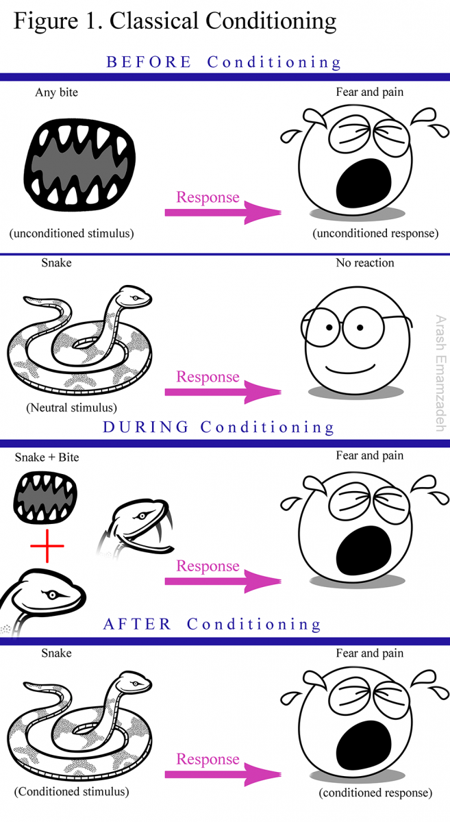 It is said that the mere sight of the mythological creature Medusa, a mortal Gorgon with a nest of venomous snakes for hair, could turn onlookers to stone. In real life, there are no such universal sources of petrification. But some common sources of fear include injections, injuries, death, aliens, heights, and snakes—the latter two being among human beings’ most prevalent fears (e.g. Agras, Sylvester, & Oliveau, 1969; Fiset, Milgrom, Weinstein, & melnick,1989; Lapouse, & Monk, 1959; Moore, Brødsgaard, & Birn, 1991; Oosterink, De Jongh, & Hoogstraten, 2009). Have you ever wondered why these fears are common? For instance, why are many of us afraid of snakes? Is it because we have been warned that snakes are dangerous? Or because they appear dangerous? Or maybe because they have actually harmed many of us? These are the kinds of questions I address in this review as I examine major psychological theories (i.e. behavioral/learning, evolutionary, cognitive, and personality), seeking to understand the genesis of common fears. As I examine these approaches, for the sake of unity I use mainly the example of fear of snakes. However, I encourage you to also think of what frightens you personally, so that as you read about different approaches, you are able to evaluate whether they can elucidate the genesis of your own fears. With that in mind, it is time to start our journey. We begin with examining three learning theories. First stop: Classical conditioning.