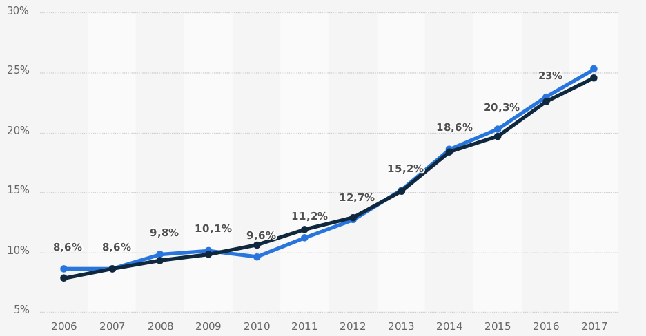 Percentage of women in supervisory boards of the 100 or 200 largest German enterprises, respectively, from 2006 to 2017. The y-axis shows the percentage of women and the x-axis the year. The light blue line shows the 100 largest German enterprises (“Top 100 Unternehmen”) whereas the dark blue line shows the 200 largest German enterprises (“Top 200 Unternehmen”).