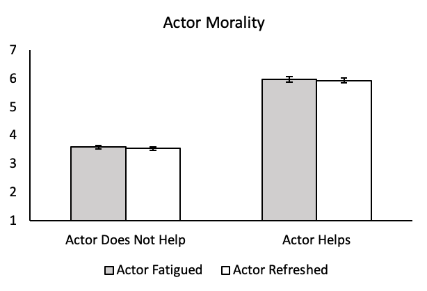 Figure 1. Perceived Actor Morality across the Actor Fatigued vs. Refreshed and Helping vs. No Helping Conditions, Study 1. Error bars reflect standard errors.