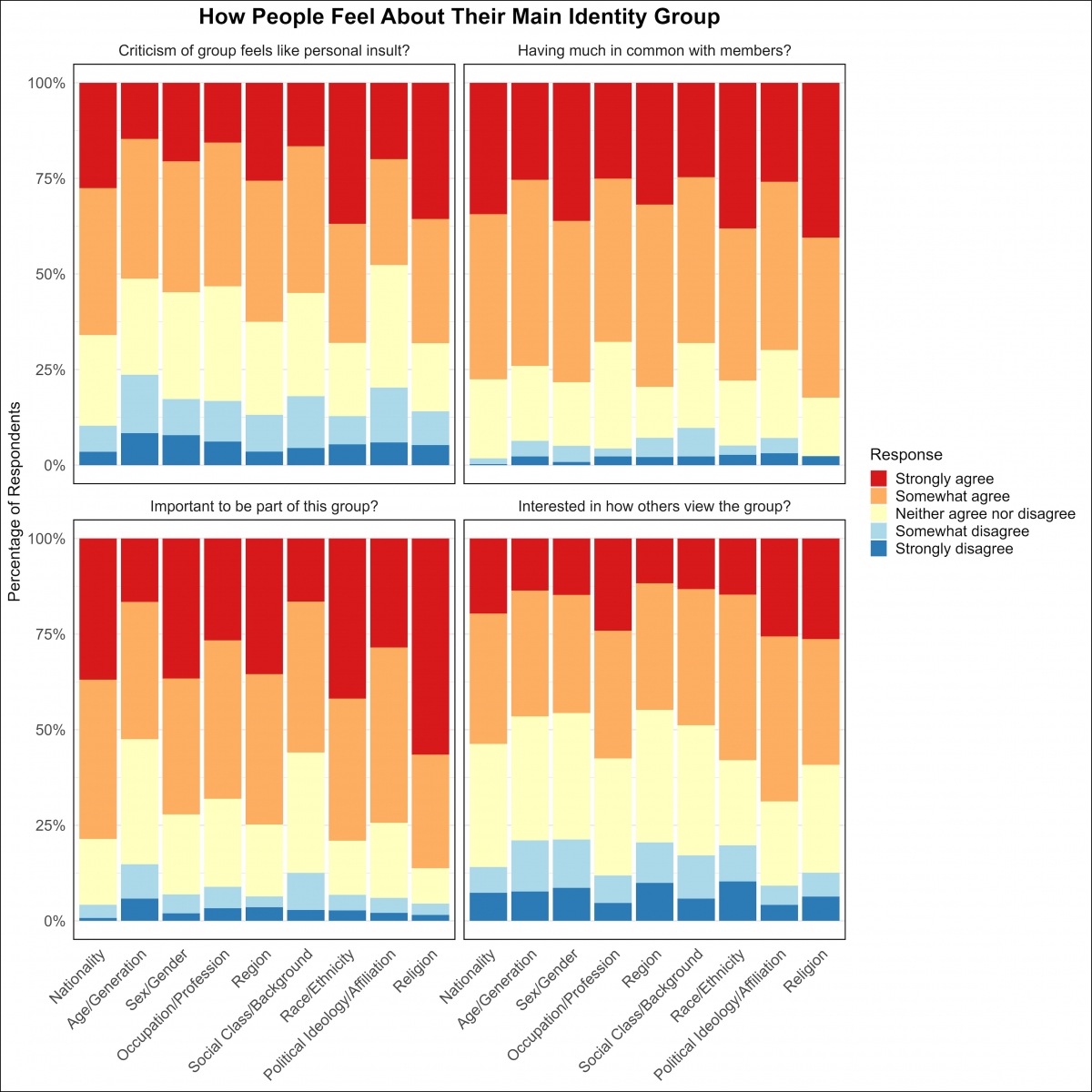 To understand what it means when someone sees an identity as central, we looked more closely at how respondents relate to the identified groups and how emotionally attached they are to them (see Figure 3). What sets nationality apart is not just how frequently it was selected as a core aspect of identity, but also the intensity of feelings associated with it. Among those who identified nationality as their most important group, about half cared how others viewed the group, and a majority agreed that they have a lot in common with other group members and that being part of the group was personally important - a pattern we also observe for other identities. But nationality stands out in how strongly people who see it as central to their identity react to criticism: 66% of these respondents said that criticism of the group would feel like a personal insult. Only religion (68.1%), race/ethnicity (68.0%), and region (62.5%) elicited similar emotional reactions - but far fewer people selected those as core aspects of their identity. It contrasts with identities like political ideology/